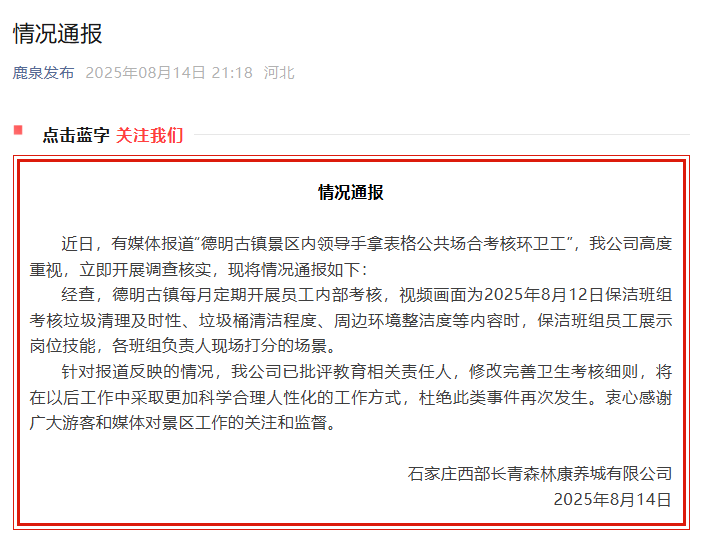 新京报讯 8月14日,石家庄西部长青森林康养城有限公司发布情况通报。内容如下: 近日,有媒体报道“德明古镇景区内领导手拿表格公共场合考核环卫工”,石家庄西部长青森林康养城有限公司高度重视,立即开展调查核实,现将情况通报如下: 经查,德明古镇每月定期开展员工内部考核,视频画面为2025年8月12日保洁班组考核垃圾清理及时性、垃圾桶清洁程度、周边环境整洁度等内容时,保洁班组员工展示岗位技能,各班组负责人现场打分的场景。 针对报道反映的情况,公司已批评教育相关责任人,修改完善卫生考核细则,将在以后工作中采取更加科学合理人性化的工作方式,杜绝此类事件再次发生。衷心感谢广大游客和媒体对景区工作的关注和监督。 |
